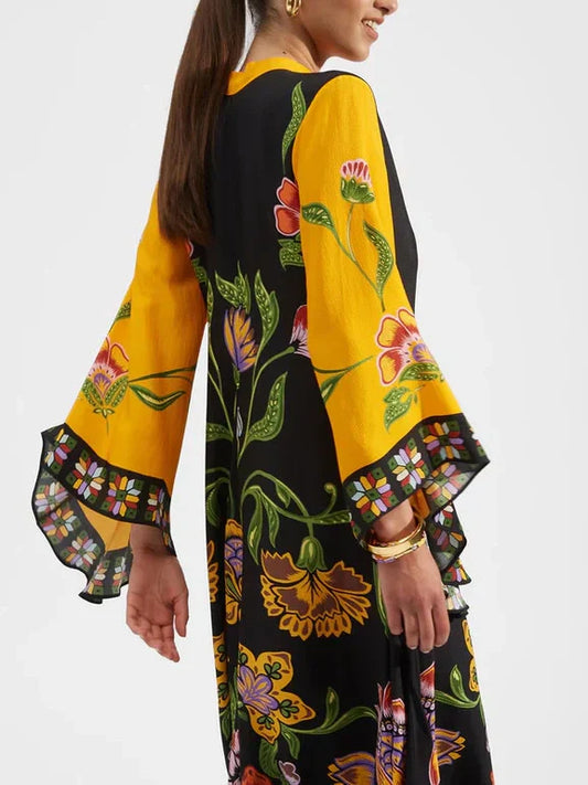 Elegance Floral Print Waterfall Sleeves Maxi Dress